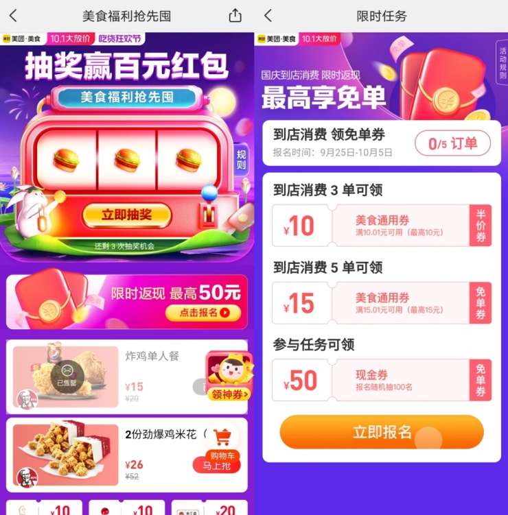 据悉,本次大促从9月25日一直持续到10月8日。美团精选餐饮优质商家推出人气爆款19.9元封顶、大牌精选5折等特惠活动。同时,美团App还发起限时返现、抽奖赢百元红包等互动玩法。即日起,用户在美团App或大众点评App首页,点击“美食”进入美食频道,点击顶部“抽奖赢百元红包”页面即可进入相应活动,赢取丰厚奖励,开启特惠之旅。9月29日起,在美团App或大众点评App搜索“聚会”或“国庆美食”即可进入活动页面享受大牌特惠。