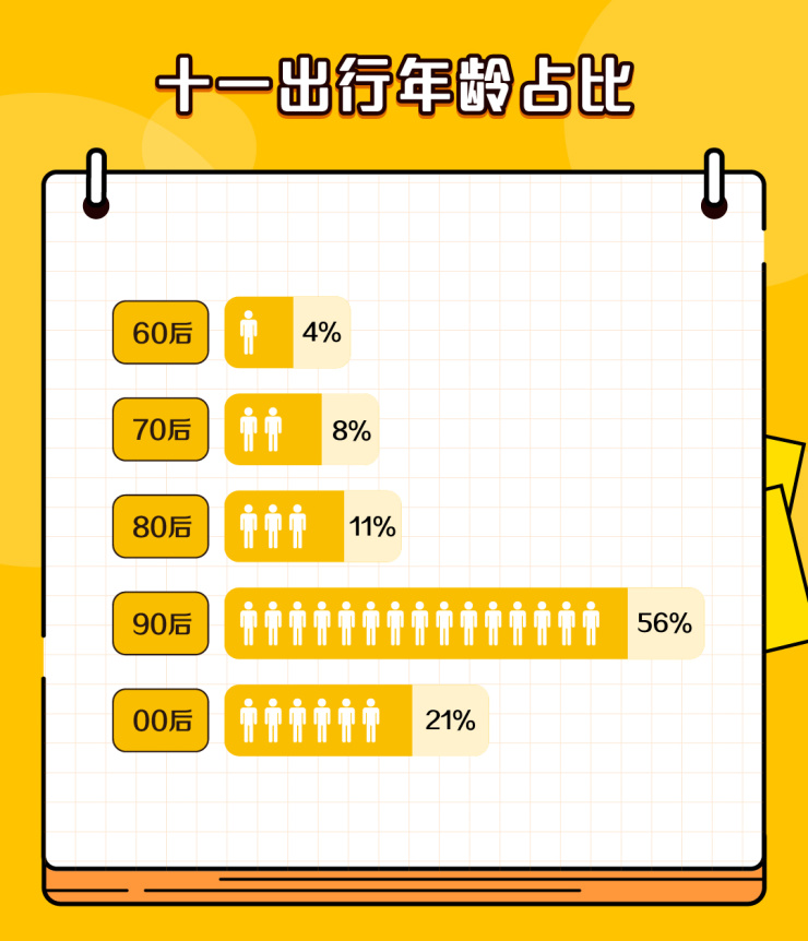 随着90后成长为职场支柱,“钱袋子”日益丰满,节日出行人群呈现年轻化趋势。在十一购票人群中,90后、00后购票人群占比达到77%,成为绝对购票主流。