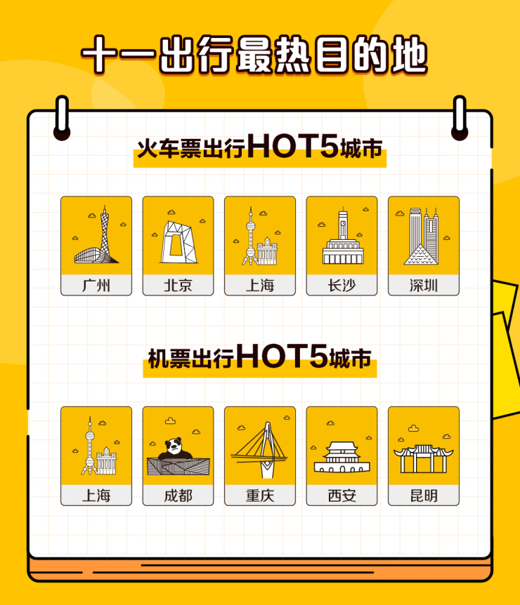 据美团火车票大数据显示,在十一出行最热目的地中,HOT 5分别是:广州、北京、上海、长沙和深圳。而美团机票大数据HOT 5城市则是:上海、成都、重庆、西安以及昆明。