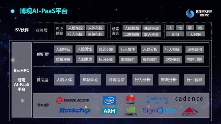 博观智能之所以能实现“重软轻硬”思路,最大支撑来自于博观AI-PAAS平台,在这一平台上的博观人像识别、车辆识别、跨镜追踪、行为分析、客流分析、行业智能六大类算法已适配国内外所有主流厂商的20余款AI芯片,全面满足各类合作伙伴的算法适配需求。