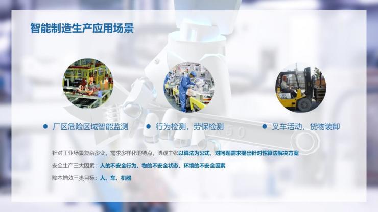 制造行业产线因生产产品的不同,因此检测目标千变万化,对于多样化的需求,博观全景AI的优势能更好地得到体现。博观主张以算法为公式,针对问题提出解决问题的方案:在企业安全层面,对企业人的不安全行为、物的不安全状态、环境的不安全因素三个层面进行智能化改造分析;在降本增效层面,对人、车、机器三个层面进行改造升级,并提出针对性的解决方案。与此同时,博观可满足企业的算法设计和定制需求,赋能工业企业顺应新旧动能转换、实现智能化升级的目标。