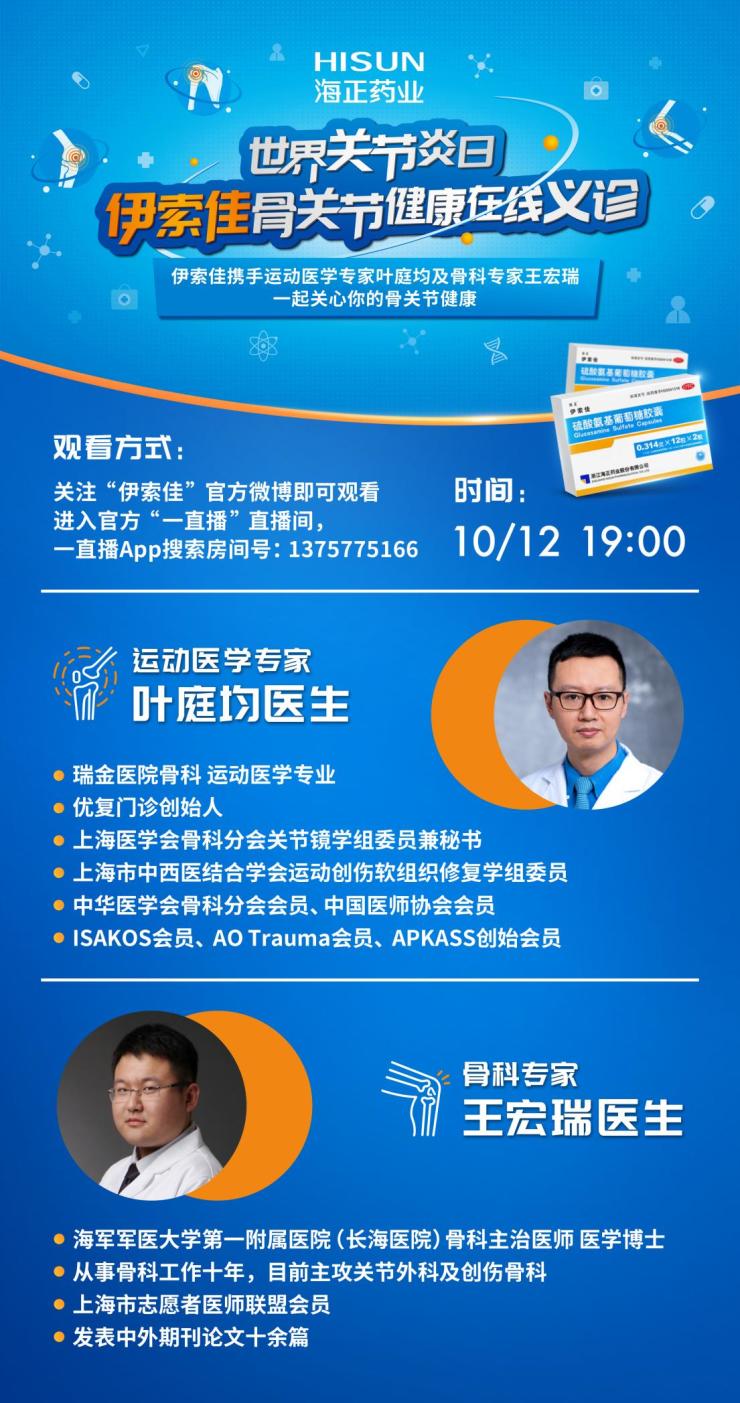 今年的10月12日是第24个世界关节炎日,为了让大家对骨关节炎有个科学认知,提高防护意识,改善病症,10月12日晚7点至9点,伊索佳硫酸氨基葡萄糖胶囊将在微博直播间举办大型直播义诊活动。届时,运动医学专家和骨科专家将亲临直播间,对骨关节炎病因、预防及治疗展开科普讲座和问答互动,为广大患者答疑解惑。同时,直播期间还有世界关节炎日促销活动和微博转评赞抽奖活动,众多神秘礼品相送,让你不虚此行!