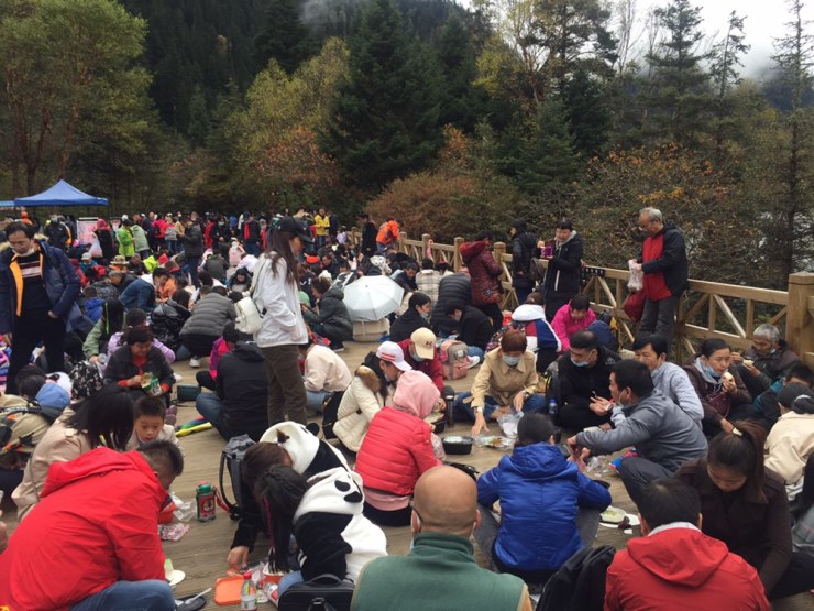 (10月4日,九寨沟内海拔4000多米的长海上“人从众”的景象)