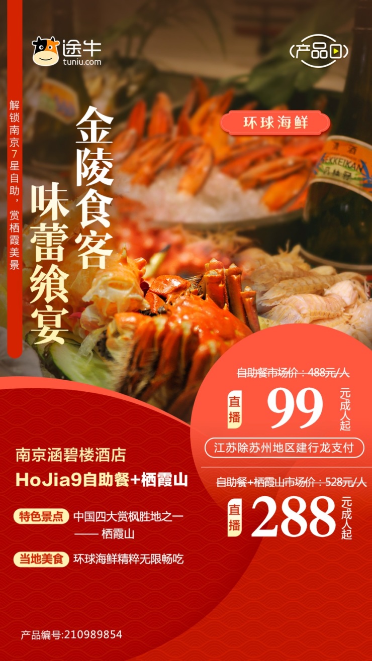 直播当晚,途牛与江苏建行龙支付合作推出的“99元爆款自驾”再度火爆来袭,“扬州中集格兰云天大酒店2日自驾游”、“乌镇优屋美宿酒店2日自驾游”仅售99元/人。“南京涵碧楼酒店HoJia9自助餐+‘六朝胜迹’栖霞山”不仅有环球海鲜精粹无限畅吃,还能尽赏被枫林浸染后的火红山峰。在直播间内下单并通过建行龙支付支付全额订单,便可专享99元/人的优惠价。