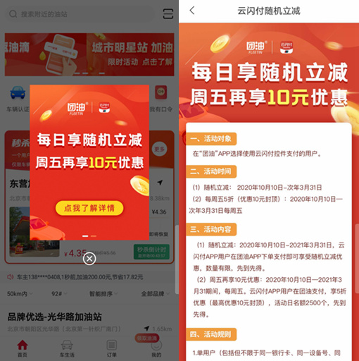 根据平台介绍,双方联合推出的加油优惠活动持续近六个月。即从2020年10月10日到2021年3月31日,每天在团油App上加油支付通过云闪付控件支付的用户,便可立享随机立减优惠。其中,周五享受5折,最高优惠可达10元,活动日名额2500个。本次活动优惠名额有限,先到先得。单用户单日单支付仅可享受1次优惠。