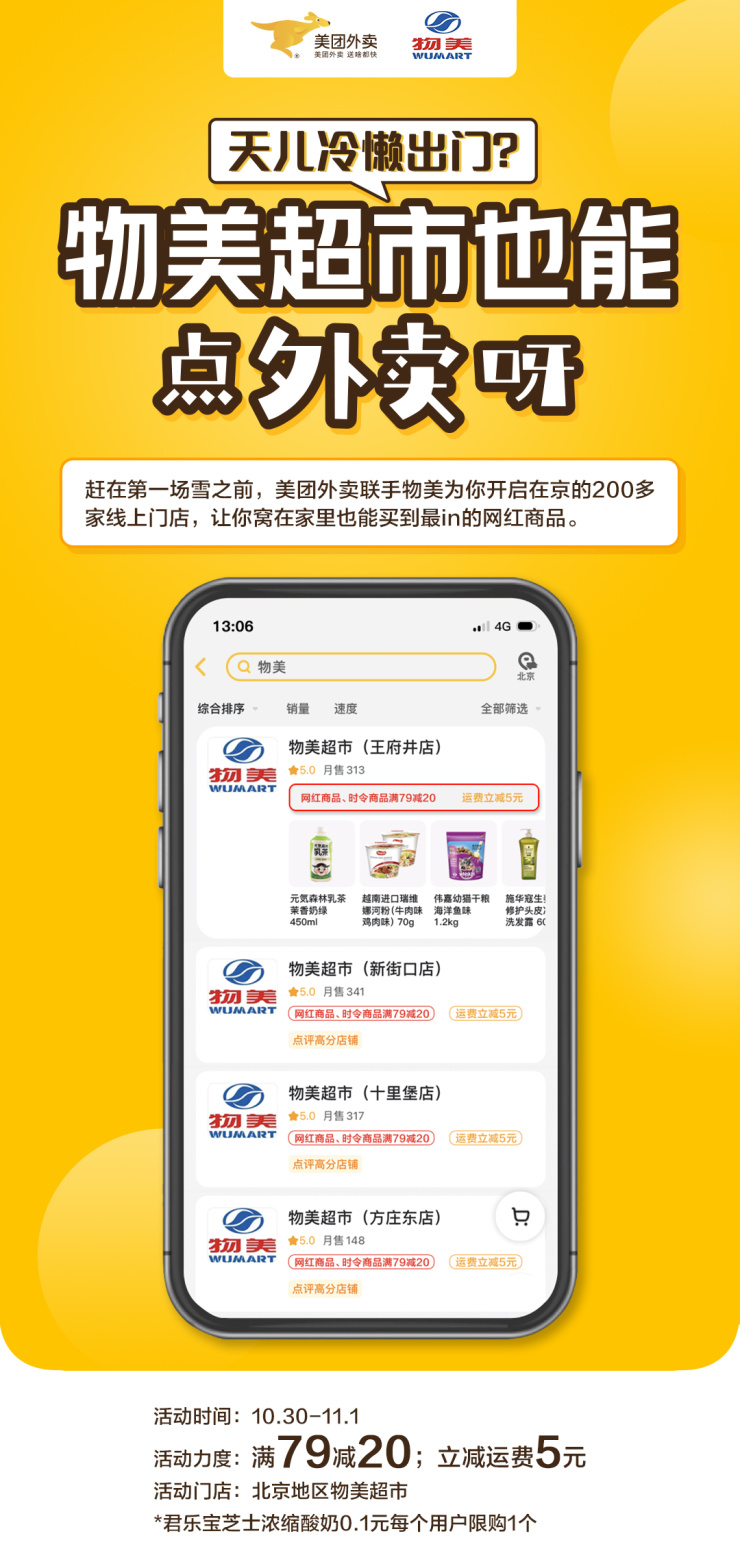 10月31日至11月1日,美团外卖联手物美超市为在京用户送福利——北京地区消费者登录美团或美团外卖APP,搜索“物美”下单,即可享受网红、时令商品满79元减20元的优惠力度,同时,还有立减5元运费的超值福利。