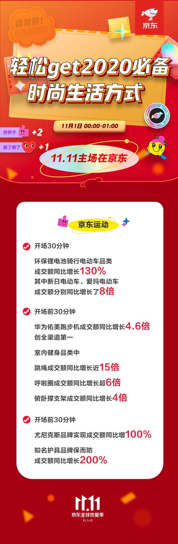 近几年的“养生热潮”中,年轻人已经慢慢成为了主力军,不过对于年轻的“养生达人”而言,他们更倾向通过运动健身等方式获得健康。今年以来,能够摆脱公共交通的电动车和能够减少人群聚集的“家庭式健身房”,成了消费者的心头好。今年京东11.11全球热爱季开门红前30分钟,环保锂电池骑行电动车品类成交额同比增长130%;开场30分钟,华为佑美跑步机成交额同比增长4.6倍。骑行产品、健身器材都收获了高增长,环保、健康已经成为新时尚生活方式。
