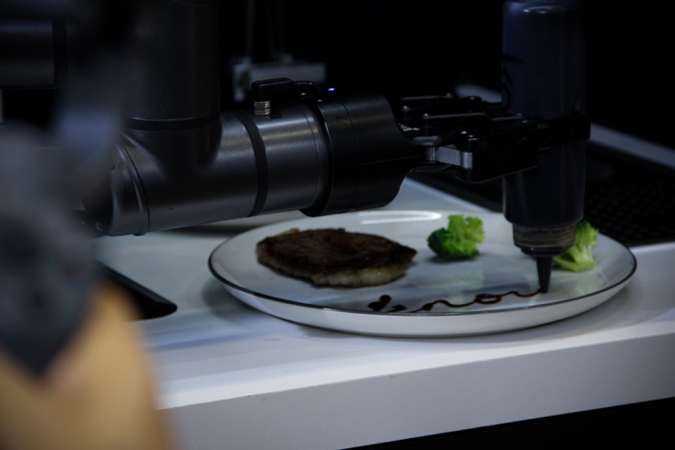 图为如影厨房机器人在现场摆盘