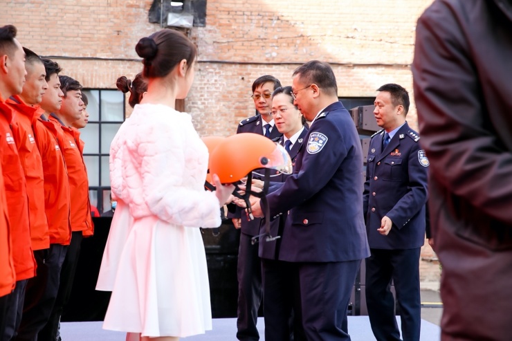 “一盔一带,安全骑行守护行动”启动仪式上,权威嘉宾为雅迪暖橙小哥佩戴头盔