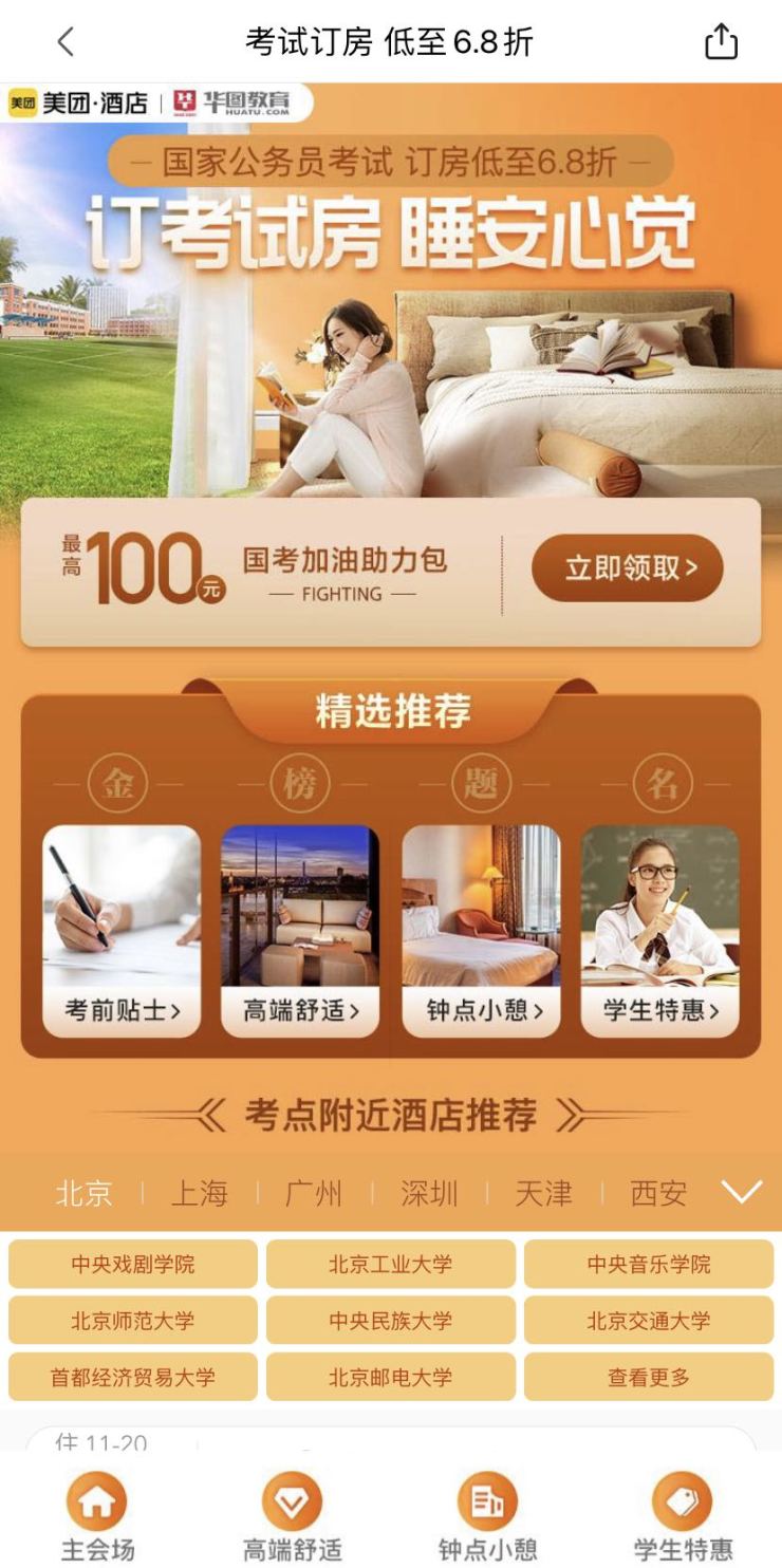 国考考试房上线美团App,订考点附近2公里酒店6.8折起