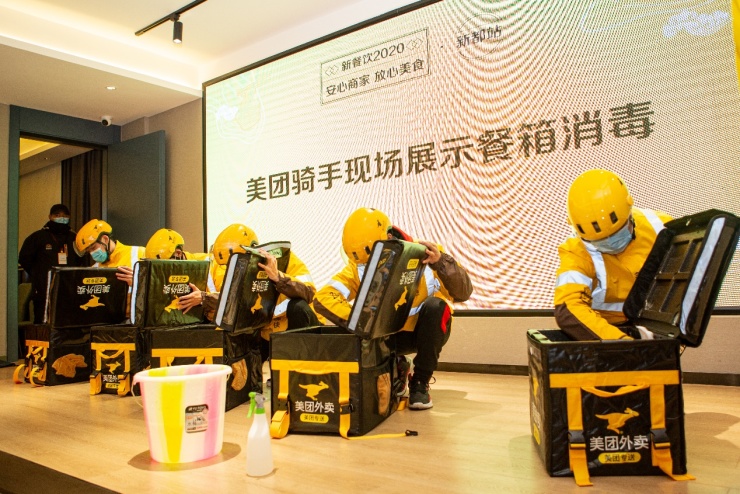 今年以来,为配合疫情防控,美团在行业内率先推出无接触配送行业标准并推广,全面升级骑手防疫设施、提升消毒设备与操作流程,研讨会现场,骑手上台演示了餐箱消毒流程。美团还通过使用并推广食安封签来实现并保障“后疫情时代安心享美食”。食安封签采用一次性特殊材料制作,由商家在餐品打包时贴上,如果被撕毁,将留下痕迹,消费者可凭封签确认餐品在配送过程中是否完好无损,从而在一定程度上杜绝人为或意外因素的食品污染。即日起,美团还将在新都全区加投30万枚食安封签,为当地食品安全再加“安全锁”。