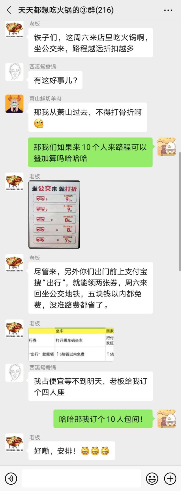 嘿!这不赶巧了吗,自家火锅店门口就是公交站,300米外就是地铁站,领了券的话车费相当于报销了。于是王老板灵机一动,推出了“来店吃火锅,按公交里程打折”的活动,在群里告诉客人出门前可以先在支付宝上领一领免费出行券,12月12日坐公车来吃火锅,大伙儿不仅坐车不用花钱,还能根据自己坐公车的里程,获得不同的折扣优惠,坐的越远折扣越大!