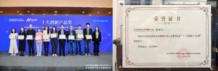 闭幕式上,南京江北新区党工委委员、管委会副主任陈潺嵋,江北新区科技创新局局长聂永军等领导为获得最佳人气奖、十大创新产品奖、论坛组织奖、最佳展示奖、最佳组织奖的企业与单位进行了颁奖。“医渡云传染病监测预警平台”能够助力实现传染病早期精准防控,该平台的发布受到领域内广泛关注,并荣获2020南京国际生命健康科技大会暨博览会“十大创新产品奖”。