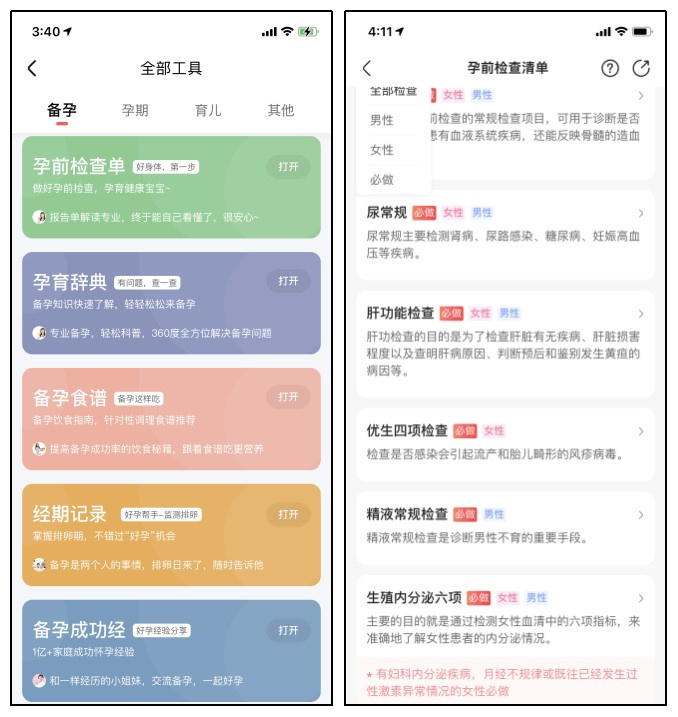 图:宝宝树孕育APP小工具列表&“孕前检查清单”