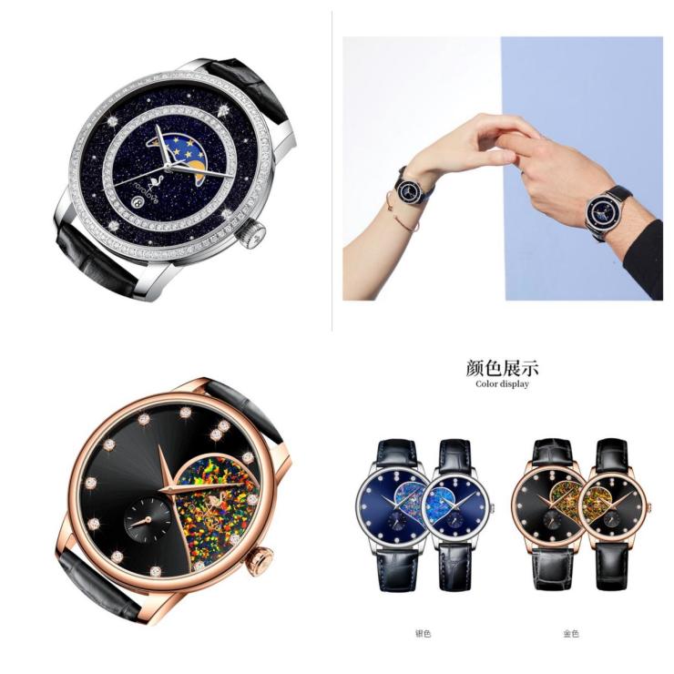 rorolove满天星情侣月相星空系列对表,蓝砂石表盘内环镶嵌52/44颗天然钻石,与表壳环镶的72/66颗天然钻石交相辉映,4颗花钉镶钻时标呈现浩瀚星轨,中心独特设计的月相窗口数枚星辰伴随月亮缓缓移动,斗转星移的盈缺变幻,记录着爱意的时刻相伴。另一款欧泊宝石时尚皮带腕表同样是情侣款热门,金银两色可选,深邃的表盘融入不规则的欧泊,宛若在宇宙眺望地球一隅,对表合二为心,13颗天然钻石刻度,将永恒爱意铭记于时光。