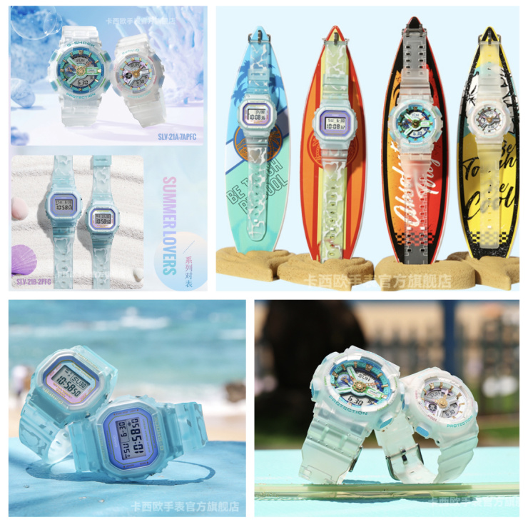 卡西欧CASIO的G-SHOCK与BABY-G携手另辟蹊径,在这个夏天联合推出Summer Lovers系列,两组充满海洋气息的时尚情侣对表,主打防水防震功能,让你在海边也能安心“浪”漫爱。圆形对表使用白色透明哑光材质,搭配多彩表盘,再现海底世界的神秘与斑斓;另一款则以经典小方块为原型,半透明的清爽淡蓝色,将夏日燥热一扫而空。手表还以海边主题打造了专属的夏日浪漫礼盒,尽显巧思,仪式感满满。