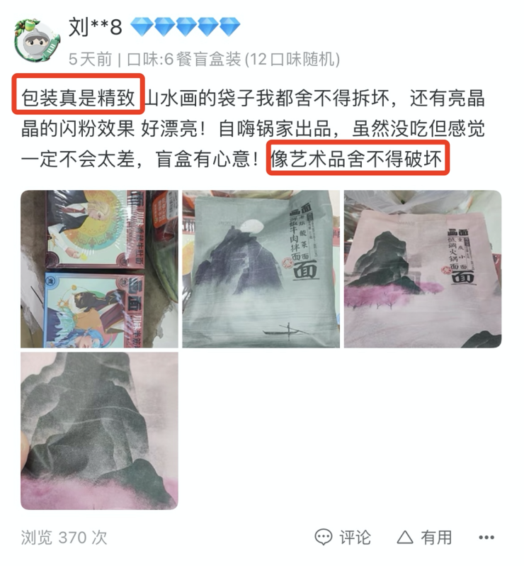 画面包装的颜值,成为许多消费者果断“剁手”的原因,有买家留言:“吃个面都如此赏心悦目”;“还没吃,但是包装已经俘获了我的心,太好看了吧!”