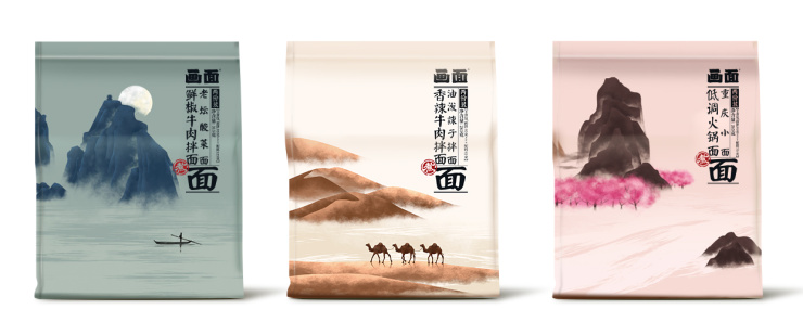 国潮、中国风是近年来的流行风向标,但在快煮面行业却少有品牌将产品与这一设计概念相结合。为了更好地展现“中国的每一面”,“画面”和中国新锐设计力量合作,用经典艺术绘画做包装,以水墨展现名山、大川、人文故事。