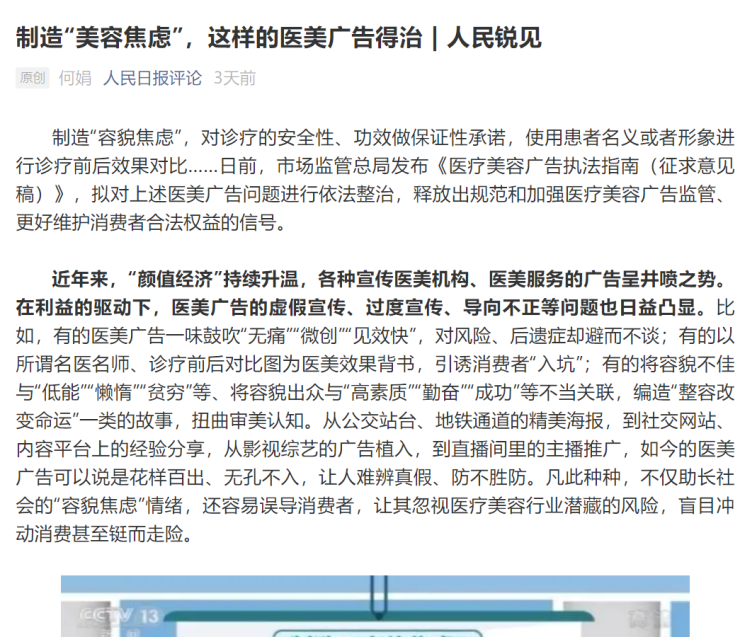 人民日报点名社交媒体违规医美广告 聚焦“社群危机”加强监管势在必行