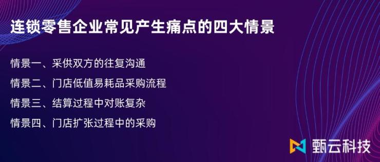甄云科技通过对连锁零售客户在项目实施阶段的深入调研分析发现,采购在业务过程围绕以下几大情景产生痛点: