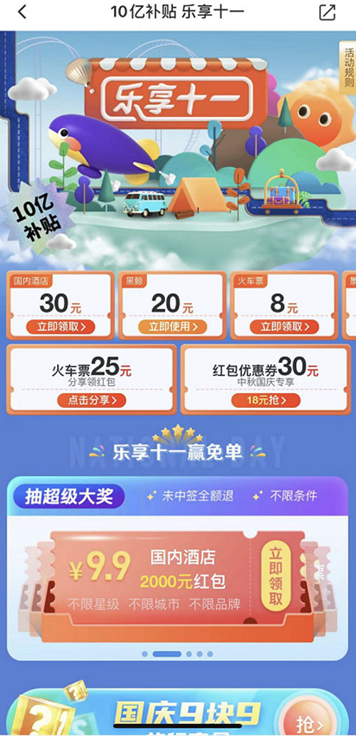 更有机会抽中酒店2000元红包惊喜福利。领国庆出游红包、火车票30元大额限量红包1元抢拍等超值权益福利等你来拿!游玩住酒店,酒店2000红包等你拿