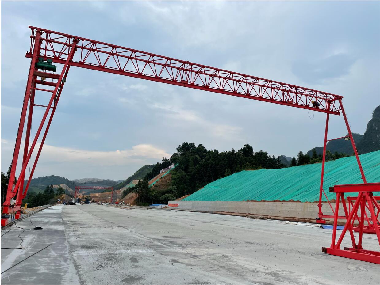 项目制梁场路基为曲线段,路基横坡较大,面外侧超高3%,梁场内外两侧高差达90cm。为攻克在半径较小且横坡较大的路基上建设梁场的难题,项目深入开展技术研讨,决定采用“高低腿”龙门吊,在龙门吊内侧立柱增加90cm调节段,有效解决内外侧轨道高低差问题,成功保证横梁水平。并在龙门吊支腿上增加活动转盘装置,在曲线上顺利实现“弯道超车”。