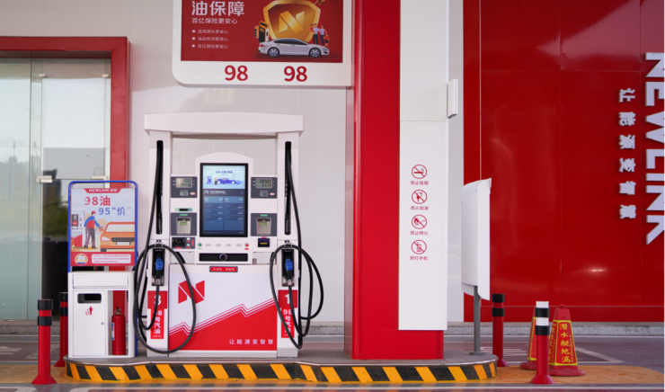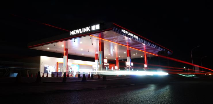 越靠近这座网红油站,越有一种让人眼前一亮的感觉——很有设计感的红色顶棚和立柱统一印刷着NEWLINK能链标识,尤其顶端檐口的LED大屏时尚感十足。大屏还可以轮播动画和文字特效,抬头往上看仿佛在世贸天阶看天幕一样,在夜晚还有霓虹闪烁的感觉,自带网红气质。