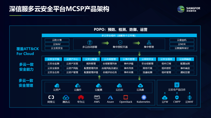 深信服云安全业务以混合多云一致安全为基石,通过深信服多云安全平台全面连接阿里云、腾讯云、华为云、AWS、OpenStack、VMware以及Kubernetes等各类公有云、私有云和容器云,可实现云主机安全、云WAAP、云防火墙、云日志审计等各类云安全组件在各个云环境中的按需分发和自动部署,帮助用户实现混合多云架构下的统一资产管理、统一云安全配置管理、统一云合规管理和统一云安全能力管理。