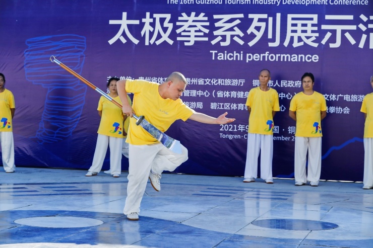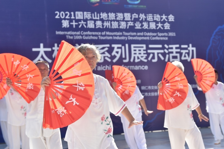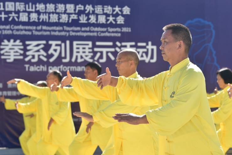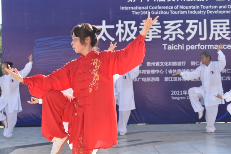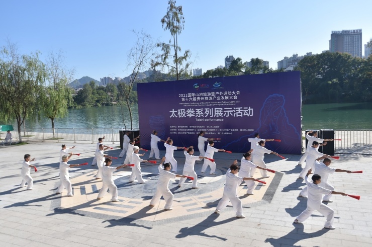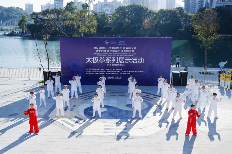 9月26日,2021国际山地旅游暨户外运动大会和第十六届贵州旅游产业发展大会(以下简称“旅游两会”) 太极拳系列展示活动在贵州省铜仁市三江公园等地举行。
