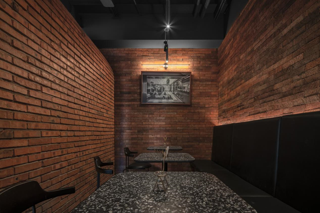 88BAR的面积只有七十多平米,两个显眼的拱形分成了吧台区、散座区和端头的一个橱窗展示空间。占据了整个空间最核心的位置的是七米多长的吧台,吧台运用了水晶砖的设计,胡同里来往的人群都会透过窗户看到酒吧里用透明发光玻璃砖堆砌的吧台侧面,此设计完美地将调酒的过程非常仪式感地展示了出来。红砖的设计灵感来源于最具艺术气息的美式工业风,顾客置身室内能够感受老城的怀旧情怀。