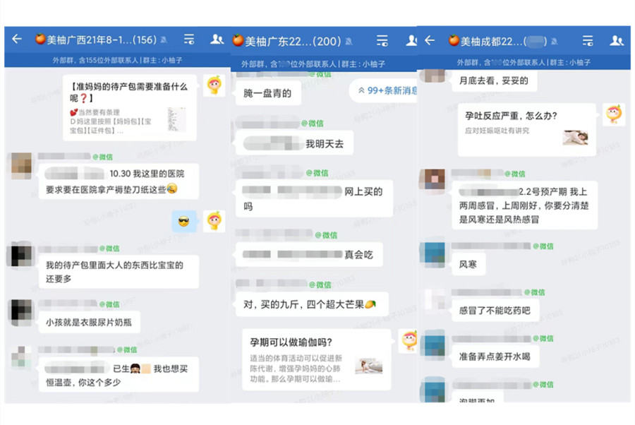 美柚APP上所有使用怀孕模式的用户可以自愿选择是否加入自己附近同孕期的妈妈群。比如一位来自深圳、预产期在22年1-3月的孕妈,可以通过美柚APP上的【同城妈妈群】小程序快速跳转至微信,加入到对应的“美柚深圳22年1-3月预产期孕妈群”。由于群内全是同城同孕期的孕妈,很快就形成了活跃友好、彼此关切的社群氛围,准妈妈们在这里相互交流孕期的感受和疑惑,社群运营人员全程积极互动,定期发布母婴科普小知识。