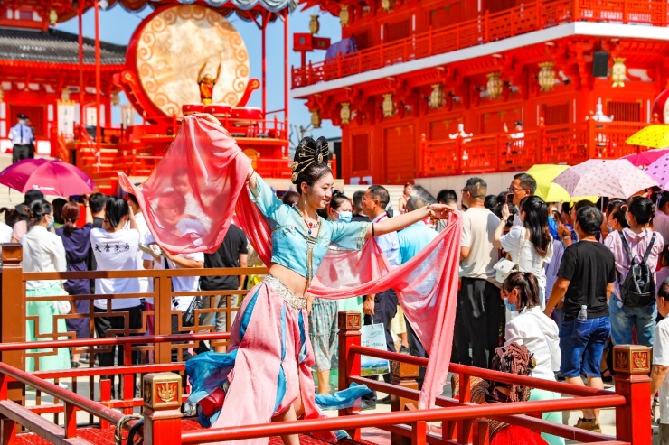 (游客在高岭·中国村中的大唐茶市景点欣赏传统舞蹈表演)