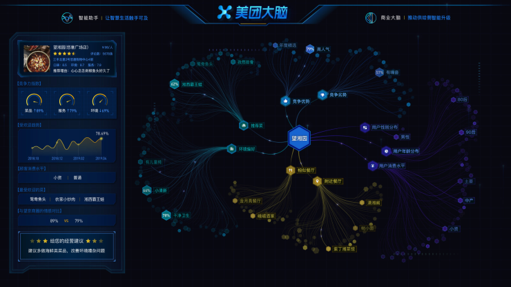 据悉,“美团大脑大数据平台”是美团基于知识图谱等AI技术能力,面向生活服务业商家提供的大数据分析决策知识图谱平台。依托于美食、酒店、旅游、到综、商品、药品等十余个领域中的千亿量级的知识数据,美团利用知识图谱技术,在合法合规的情况下,对平台的公开数据进行深入挖掘和分析,通过细致刻画商家服务现状、商家竞争力分析,以及商圈洞察等方式,为商户提供精细化经营建议,带动生活服务产业数字化优化升级。目前已有超过10万商家可以通过美团SaaS收银系统使用美团大脑能力查看本店的实时经营状态与经营建议。