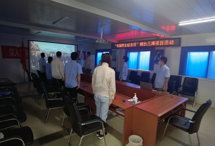 烟台三滩项目部发挥央企党建思想引领作用,在庆祝中国共产党成立100周年之际,陆续开展加强员工思想政治教育工作,分时间点组织收看了《1921》、“9.30烈士纪念日”直播、《长津湖》爱国影片和进行升国旗仪式等,深刻纪念烈士和人民英雄,铭记历史,项目部以“纪念烈士,致敬英雄” “砥砺前行,努力奋斗”为主题,收看相关影片及视频直播加强学习,深入的进行思想政治教育;每一次的纪念都是对历史的纪念,都是为了全新的出发,通过观影和纪念活动,耕续英雄的精神,砥砺前行,努力奋斗,增强员工在各自工作岗位上为公司、祖国建设贡献力量的责任感,传递温暖强化央企听党话,跟党走的央企热情,为“学党史·更党走·感党恩”主题活动进一步充实为群众办实事系列活动。