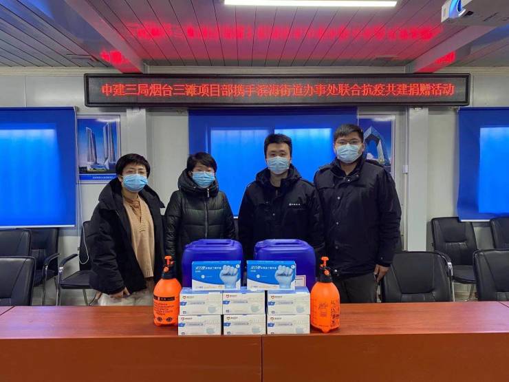 2月2日,烟台三滩项目部与滨海街道办事处学府社区党支部及社区居委会进行了联合抗疫共建捐赠活动,项目部为社区赠送了预防新冠肺炎宣传横幅和新冠疫苗注射宣传贴画,分别抽调了五名管理人员利用三天的时间为社区加班加点的统计采集人员信息,项目部还积极筹措防疫物资,为社区捐赠84消毒液、手套、口罩、消毒喷壶等防疫物资。