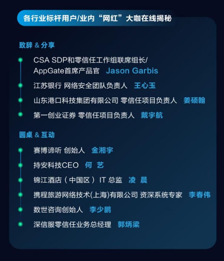 从海报还可以惊喜地看到,活动还邀请了CSA SDP和零信任工作组联席组长、AppGate首席产品官 Jason Garbis,分享解决零信任落地难题的建议。连麦环节也可以说是足够吸睛了,观众如果有任何疑问,现场的这些大咖嘉宾将可以实时进行一对一解答。