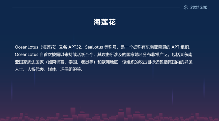 10月23日,在第五届看雪安全开发者峰会(2021 SDC)中,深信服蓝军高级威胁攻防研究员闫忠进行了主题为《多维度视角下APT挖掘实践》的分享,以追踪海莲花APT组织攻击活动的实战经验为例,详细分析了反向追踪APT组织的实战思路。