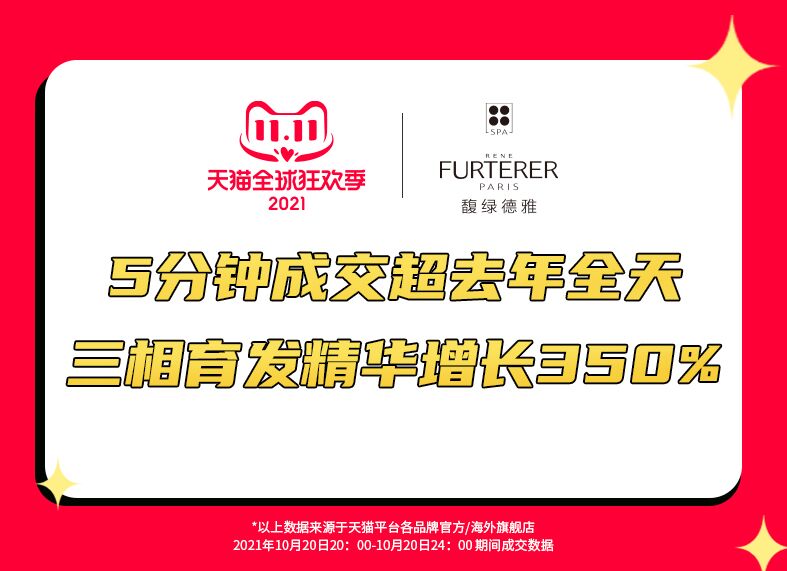 2021天猫双11在10月20日正式开售,丽人丽妆运营的馥绿德雅官方旗舰店强势起跑,全店5分钟超越去年,明星产品馥绿德雅三相育发精华液2小时成交超千万元,同比去年预售全阶段增长350%,产品热销16.5w+支,小白珠固发育发洗发水预售2小时成交超10,000+件,同比去年预售全阶段增幅达386%,馥绿德雅喜迎2021双11开门红。