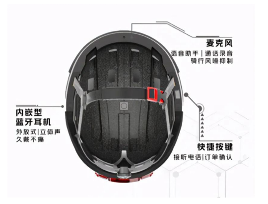 在智能配置方面,美团智能安全头盔内置蓝牙模块,能够与骑手的手机无线连接,骑手可通过单击或长按3秒的方式确认接单、接听或者拒接来电。其中,蓝牙耳机为外放式立体声,久戴不累;麦克风具备风噪抑制功能,保障沟通顺畅。为方便骑手配送,美团智能安全头盔还支持语音控制,解放骑手双手。