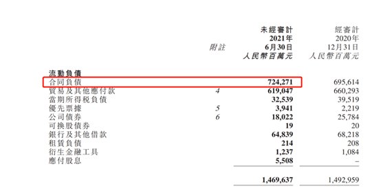 此外,碧桂园中报披露,负债中含合同负债 7242.71 亿元,占总负债的 41.63%。 这个数据即是前文提到的地产公司已预售但未确认收入的房款。合同负债量不仅不能说明“暴雷风险”,反而还体现了房企未来的业绩增长空间。