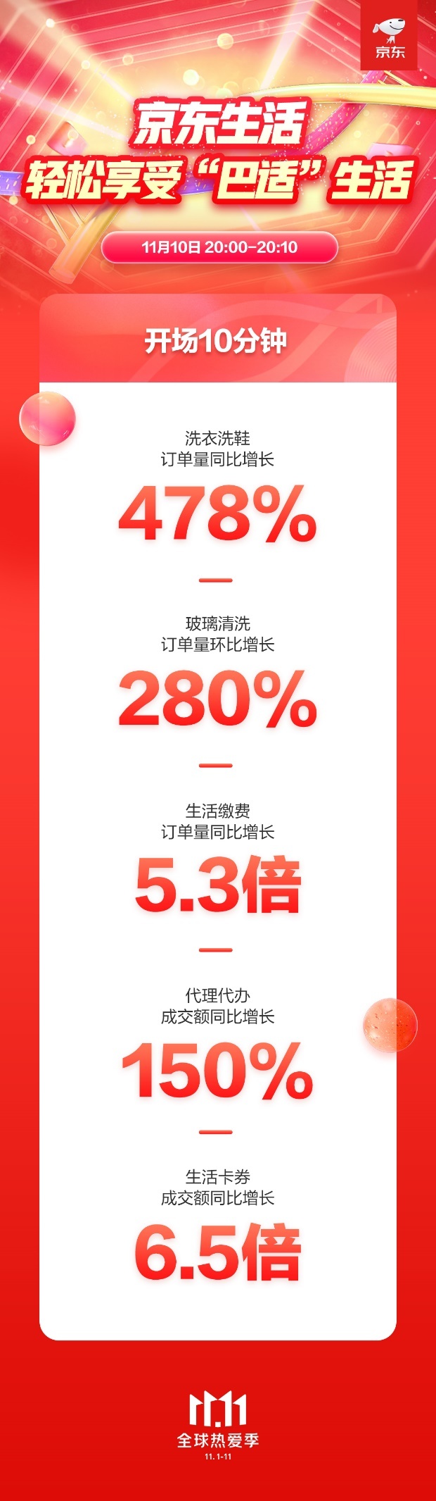 不仅不用出门,京东生活上洗衣洗鞋、玻璃清洗等“上门服务”也备受消费者热捧。前10分钟,洗衣洗鞋订单量同比增长478%、玻璃清洗订单量环比增长280%,轻松搞定家务事。而期待到店“薅羊毛”的消费者也在通过京东生活收获意惊喜,京东11.11爆发日开场瞬间,生活卡券成交额同比增长6.5倍。