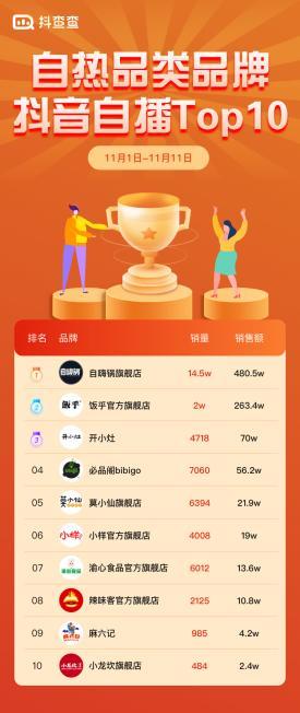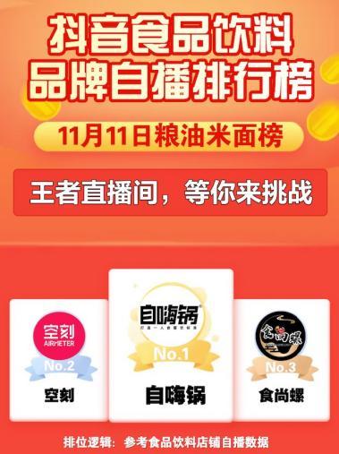 自嗨锅在抖音品牌自播一直都跑在食品榜单前列,4月份战绩就已经连续多场破百万GMV,今年抖音双十一也多个品牌占据榜首位置;