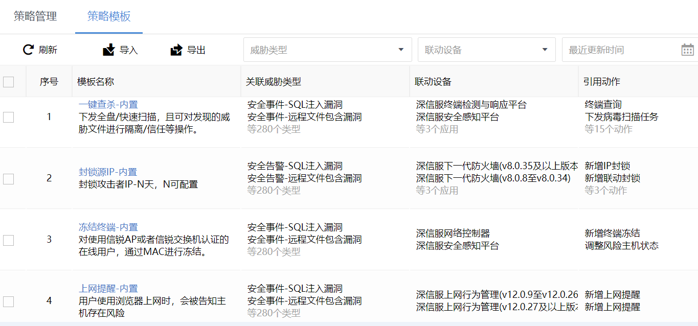 面对已经确认的安全威胁,深信服NDR围绕SOAR(安全编排与自动化响应)的强大功能,涵盖勒索病毒、僵尸网络、漏洞攻击、暴力破解等20+的事件类型,通过预定义/自定义组合多个元素(时间、风险等级、资产范围)进行策略设定,自动联动自有生态的下一代防火墙AF、终端检测响应平台EDR、全网行为管理AC等闭环处置,甚至与第三方API接口跨生态联动,将用户的业务情况和安全等级,分为高、中、低威胁标签化处理。