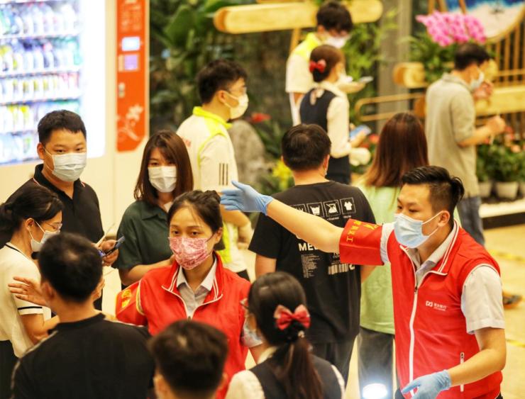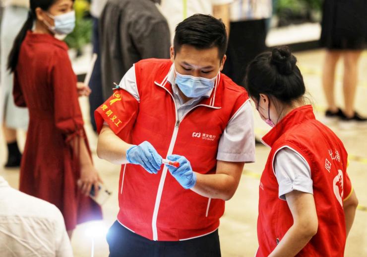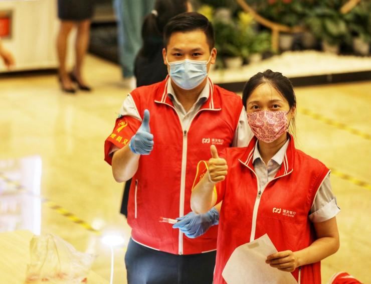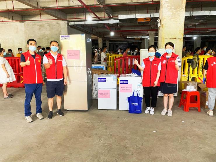 浦发银行广州分行辖属佛山分行、锦城支行等机构的党员、群众志愿者们主动走进一线,为现场医护人员送去清凉饮品、纸巾以及提供冰箱冰柜,方便医护人员保存核酸检测试剂,同时参与维护公共服务秩序,提醒排队的群众做好个人防护,有序进行核酸检测。