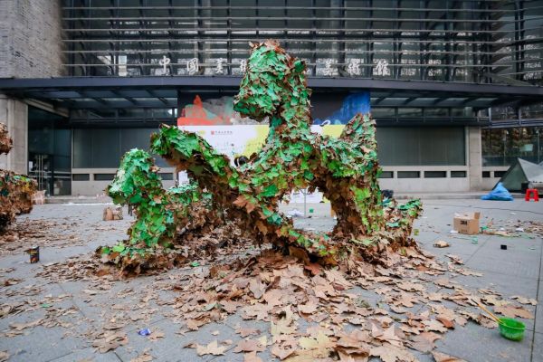 秋叶艺术节负责人陈骁介绍,这次展示的几组落叶雕塑作品,都是围绕着“未来”这个主题创意设计,从中可以看到这届年轻人眼中的未来是怎么样的。完成这些创作共用了约上千斤的落叶,内部结构为钢筋和木板搭建而成。陈骁说,美院学生与落叶的约定,十几年来未曾失约过,这已经不是学生们自娱自乐的活动,而是全民一起参与的公共艺术。