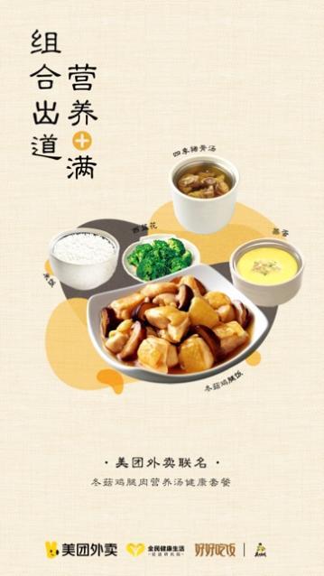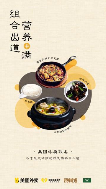 对美食商家来说,想要抓住当今消费者的胃,做得“好吃”只是基本功,高度迎合他们的饮食新习惯才是关键。所以,基于对年轻人的饮食趋势的了解,美团外卖在本次“平衡膳食”主题专场,特别联合云海肴、真功夫分别推出了【美团外卖联名】冬季限定猪肚花胶汽锅鸡单人餐,及【美团外卖联名】冬菇鸡腿肉营养汤健康套餐,并由全民营养健康研究院专家给出科学指导意见,充分满足了消费者对外卖营养均衡的健康需求。