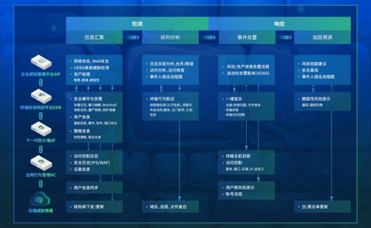 深信服安全联动能力体系以全流量分析为核心,结合各类安全设备日志,利用威胁情报、UEBA、机器学习、大数据关联分析等技术,对全网的安全进行实时检测与分析,及时发现内网潜伏威胁和失陷主机,联动安全组件进行快速响应,有效防护各类已知威胁和高级威胁。同时,网端数据的有效结合能够将更多的安全日志聚合为安全事件,降低海量安全日志的研判难度,减少大量告警误报,提升安全运维人员的工作效率。