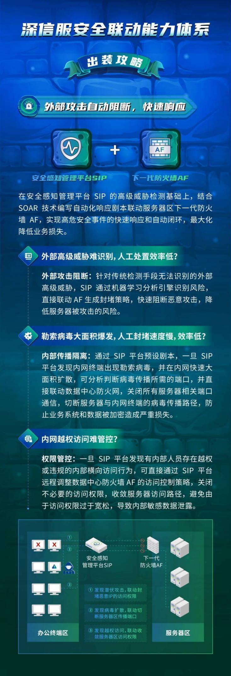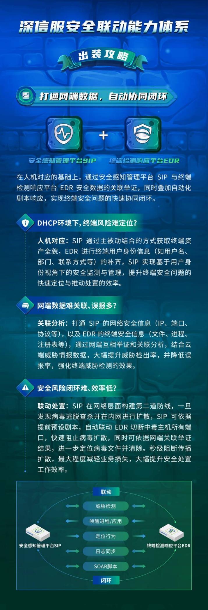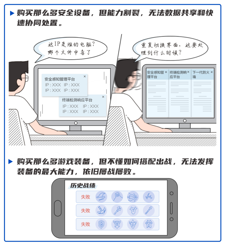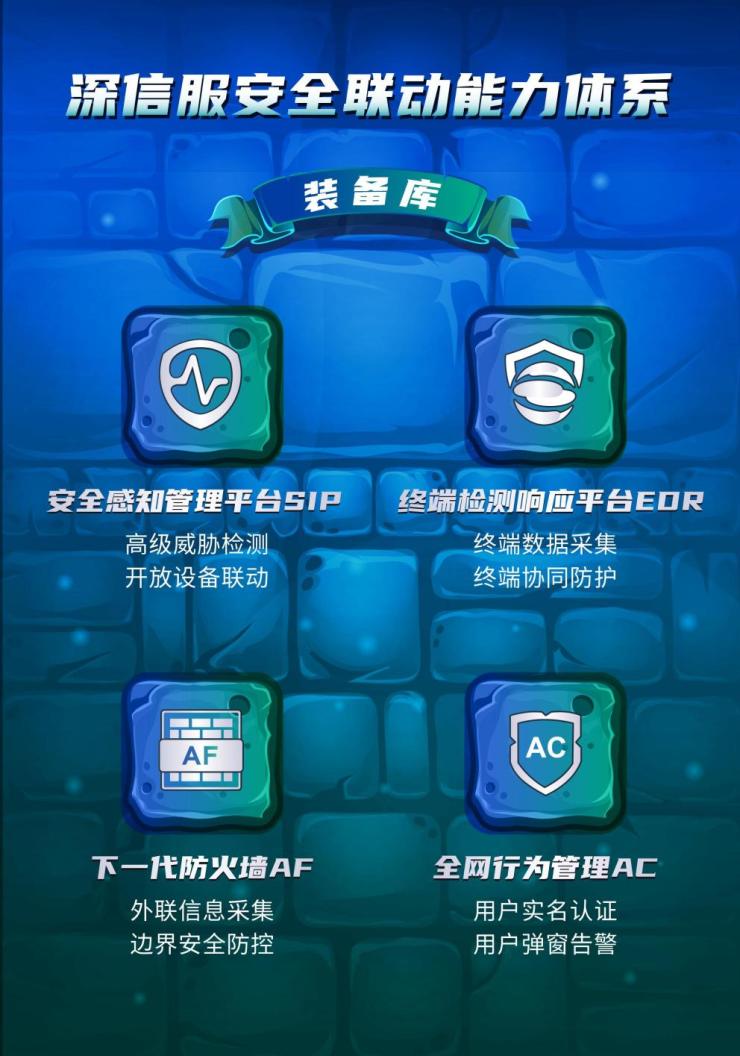 如果把所有的安全设备比作“游戏装备”,只有打破“装备”之间的能力壁垒,进行合适的搭配,联动“出装”,才能将价值最大化,达到1+1>2的实战效果。