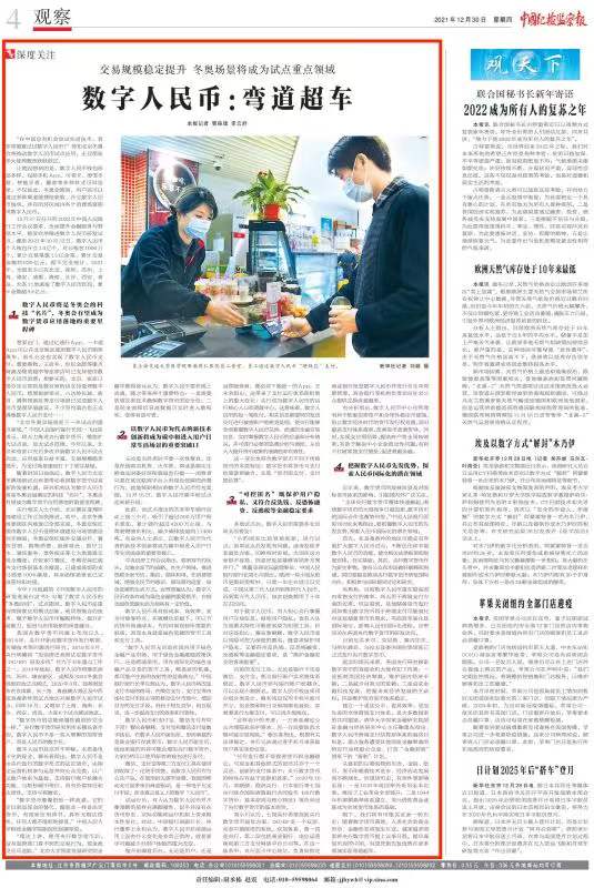 12月30日,中纪委官网、中国纪检监察报刊发题为《数字人民币:弯道超车》的深度报道。报道提到,数字人民币碳中和试点三个月减碳超过万吨,数字人民币有条件成为绿色金融的重要抓手,在推动绿色低碳生活方面具有价值,以数字人民币为代表的新技术创新将成为碳中和进入用户日常生活场景的重要突破口。
