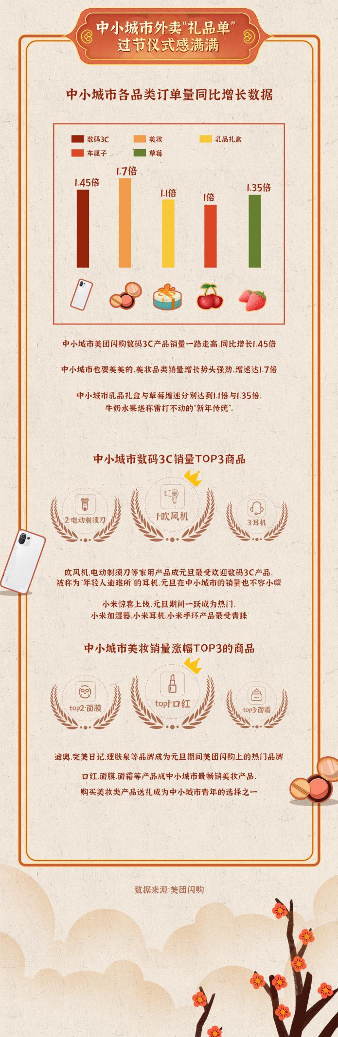 据美团闪购介绍,元旦期间的中小城市订单中,数码3C、美妆、高端水果等具有礼物属性的商品,订单量同比增长明显。